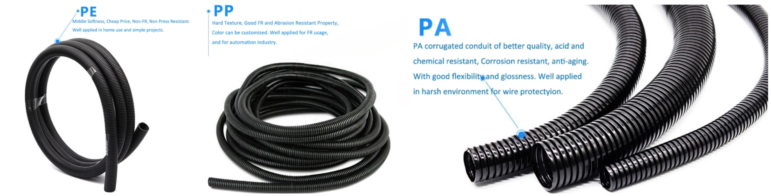 electronic,mechanical wiring harness and other fields, replacing the original PVC and metal sheath products, and becoming a widely used wiring harness sheath product on the market. In addition, plastic corrugated pipes are also used in municipal engineering,underground burying of rainwater in residential quarters, sewage discharge, irrigation of farmland, drainage of waterlogging, etc.
